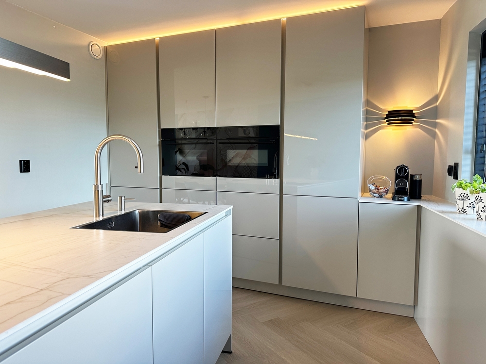 Bijzonderheden: extreem mat anti-fingerprint front (super mat, makkelijk schoon te maken, in hoge mate UV-bestendig en een aangename “look and feel”) Tevens is de keuken uitgerust met een stoomoven en kookplaat met afzuiging.