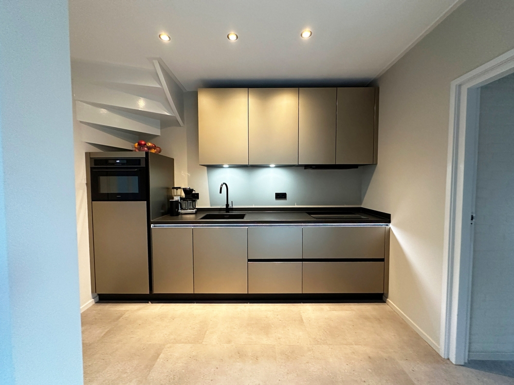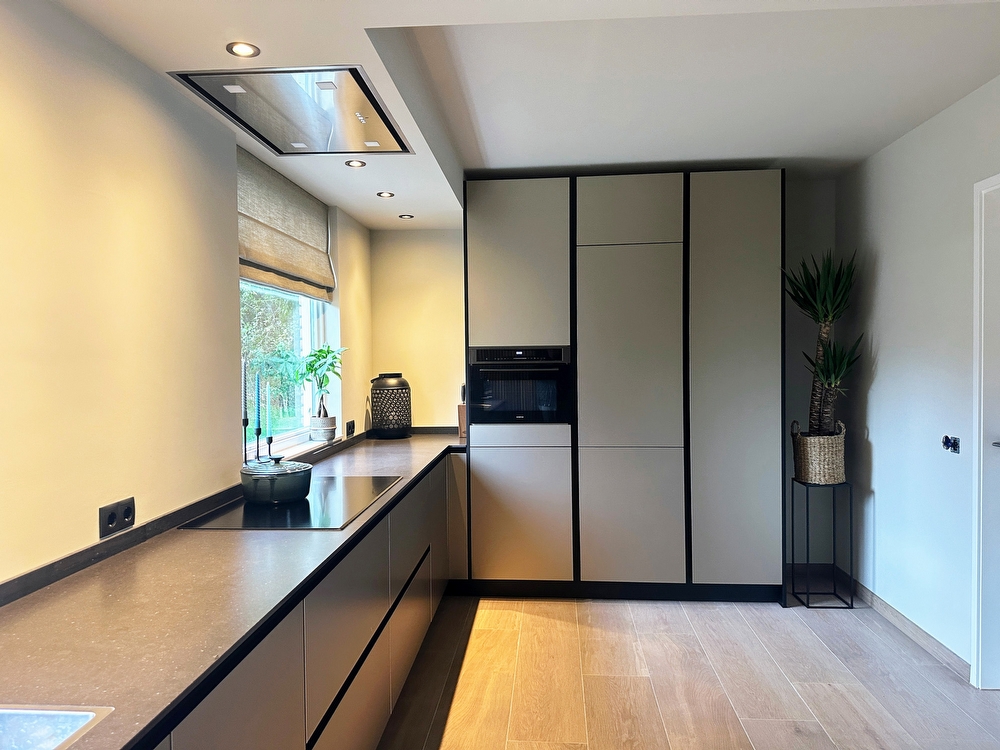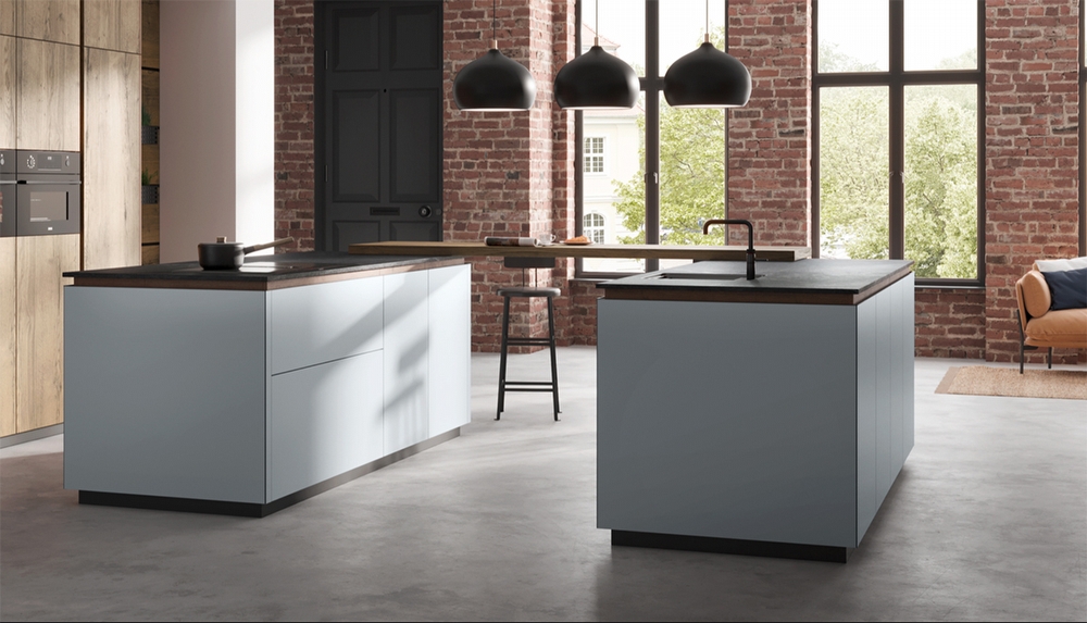 Achter de ‘zwevende’ vormwanden in frontuitvoering, met een matzwart metalen designprofiel op de hoeken, gaan New Dimensions onderkasten schuil. De extra hoge onderkasten met 16% meer kastinhoud zorgen voor een ergonomische werkhoogte en minder verloren ruimte achter de plint.