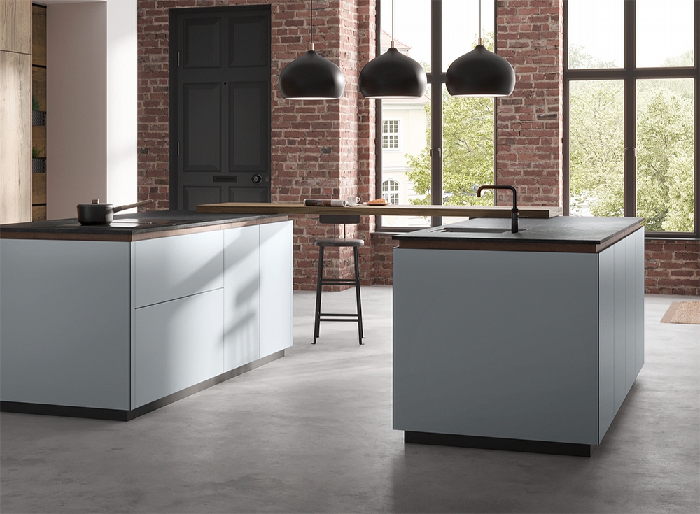 Achter de ‘zwevende’ vormwanden in frontuitvoering, met een matzwart metalen designprofiel op de hoeken, gaan New Dimensions onderkasten schuil. De extra hoge onderkasten met 16% meer kastinhoud zorgen voor een ergonomische werkhoogte en minder verloren ruimte achter de plint.