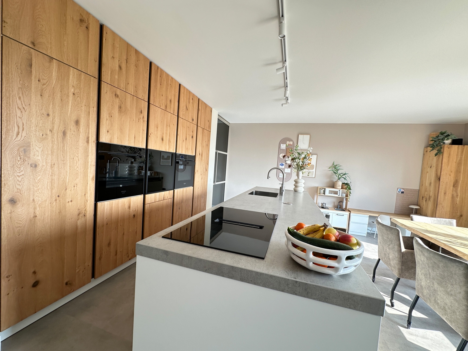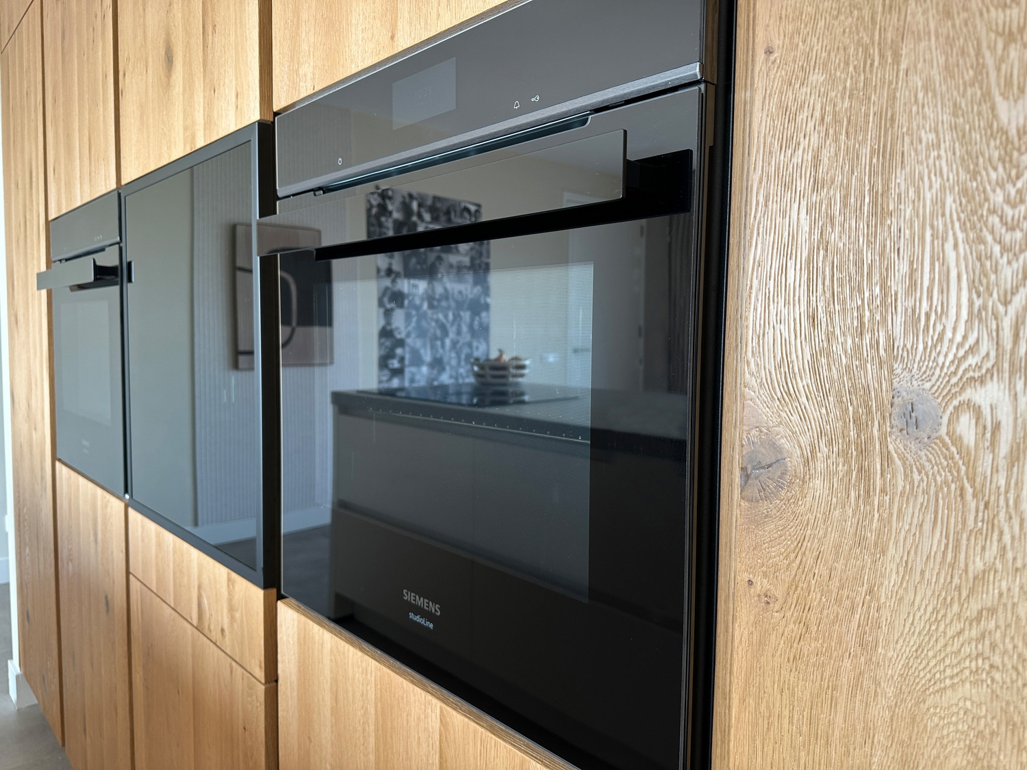 Echt hout met witte fronten gecombineerd en alle praktische en luxe apparatuur van Siemens. De uitgebreide kookplaat met afzuiging, aangevuld met PlasmaMade filter. Een grote koelkast met een losse inbouw vriezer. Twee ovens van 60 cm waarvan 1 met Fullsteam. De Home Assistent helpt met de vele voorgeprogrammeerde recepten altijd het gerecht op de juiste manier bereiden. De vaatwasser is een XXL model met PerfectDry (Zeolith).