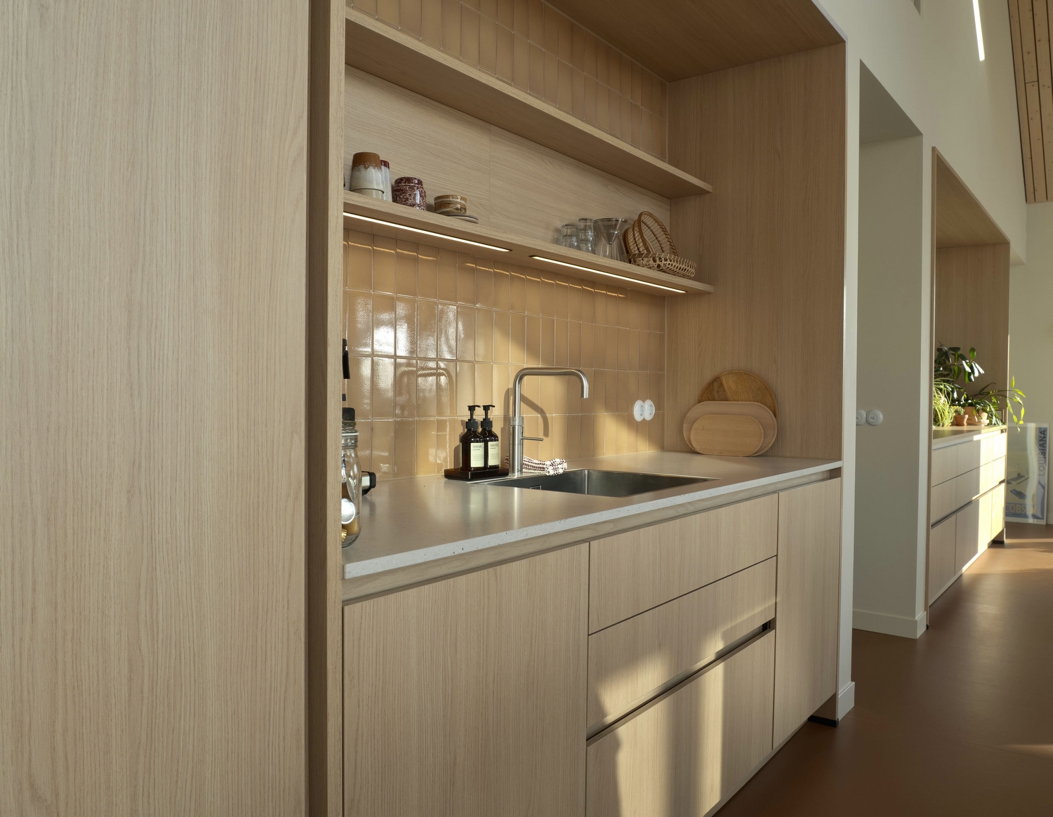 De keuken is uitgevoerd in het warme Vicenza Oak – zowel voor de fronten als de korpus. Dit houtdecor geeft de ruimte een rustige, natuurlijke basis. Het composiet werkblad in Lime Delight (20 mm) zorgt voor een subtiel contrast en maakt het geheel licht en elegant.