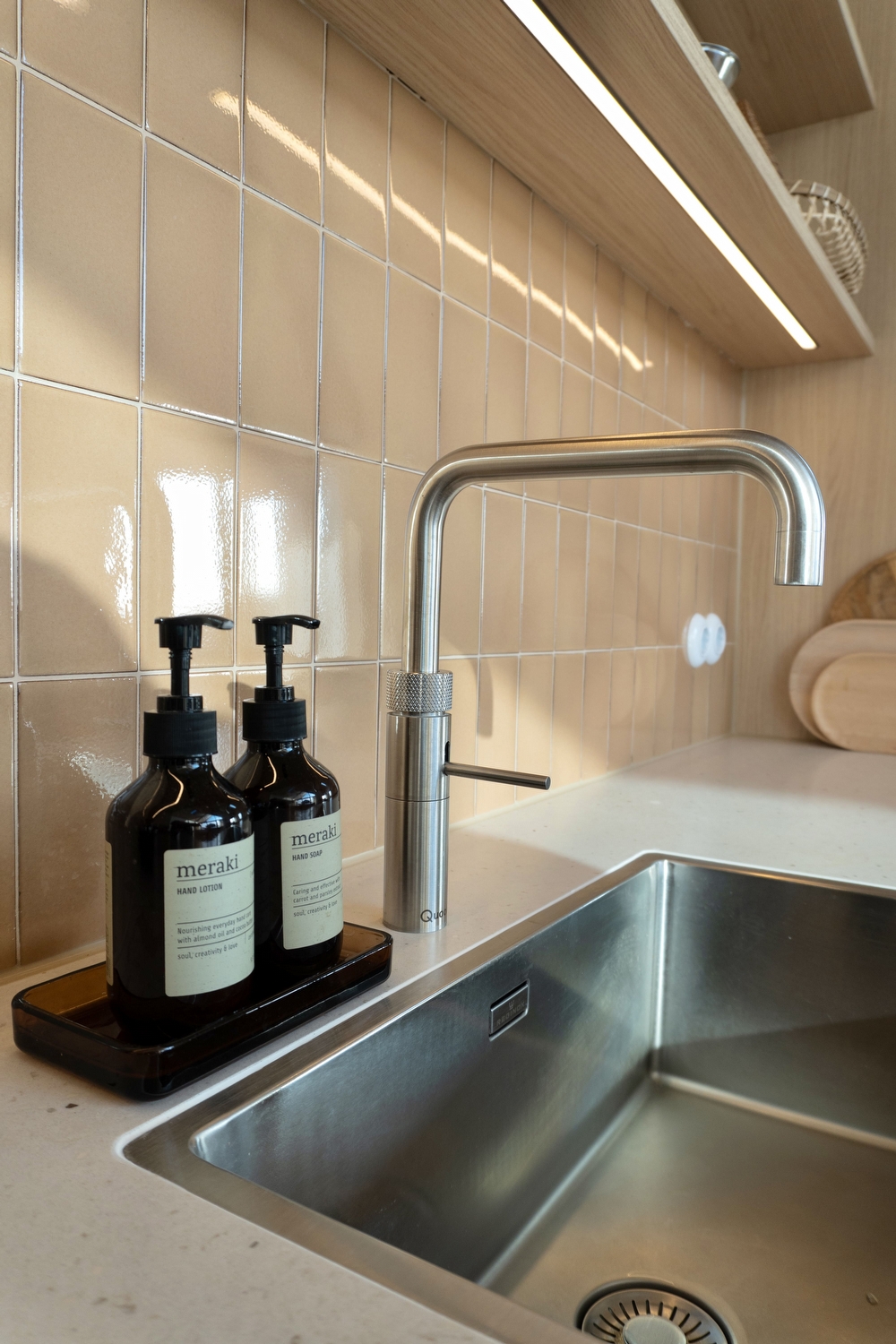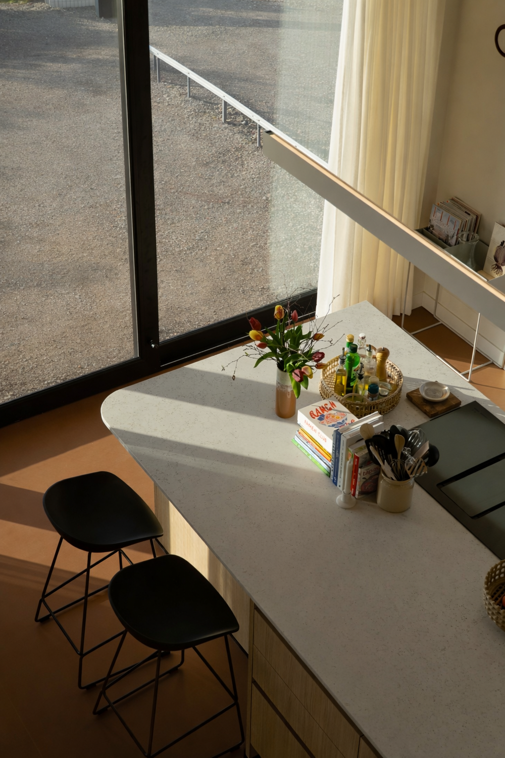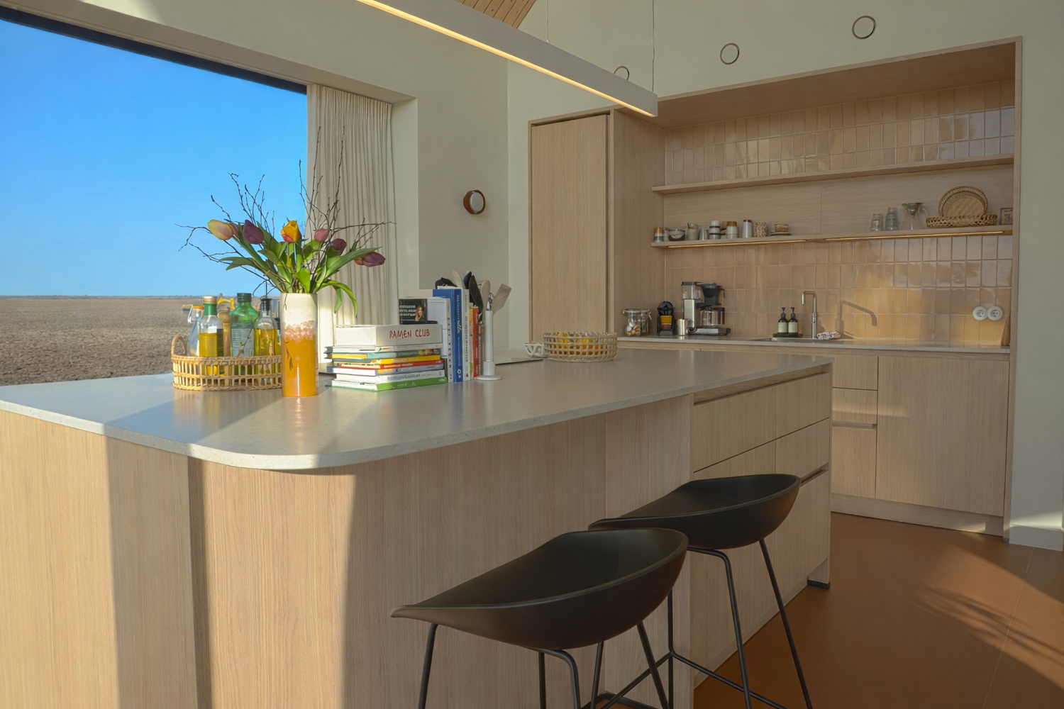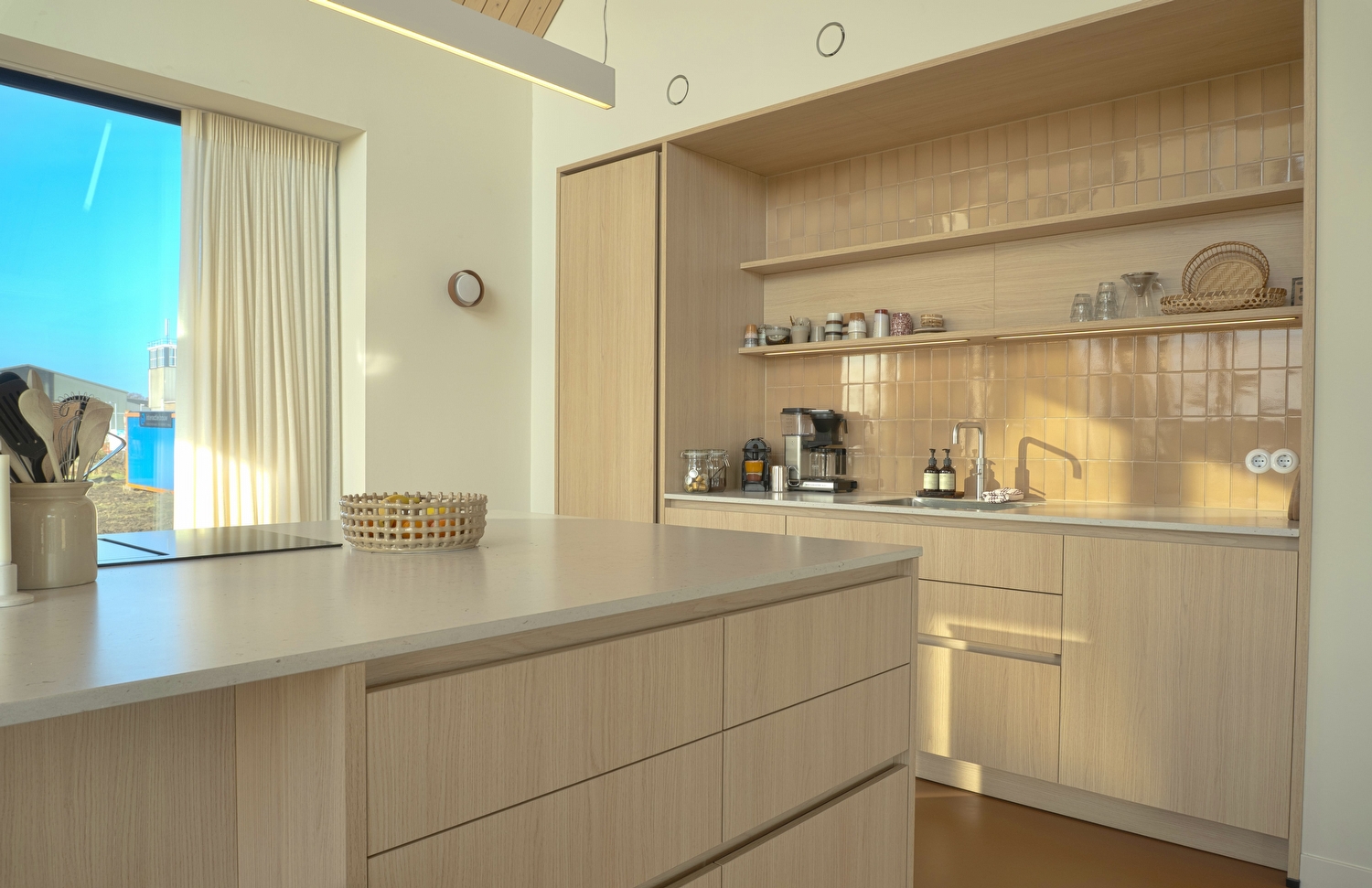 - Blikvanger: Het minimalistische kookeiland met de lange hanglamp erboven, versterkt door het warme tegelwerk in de nis.