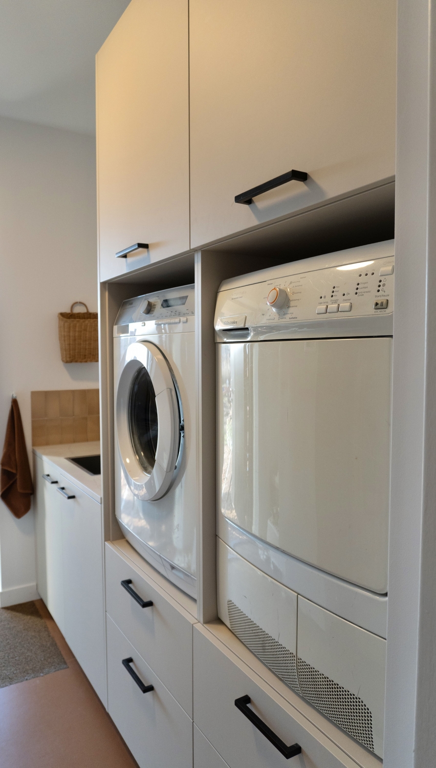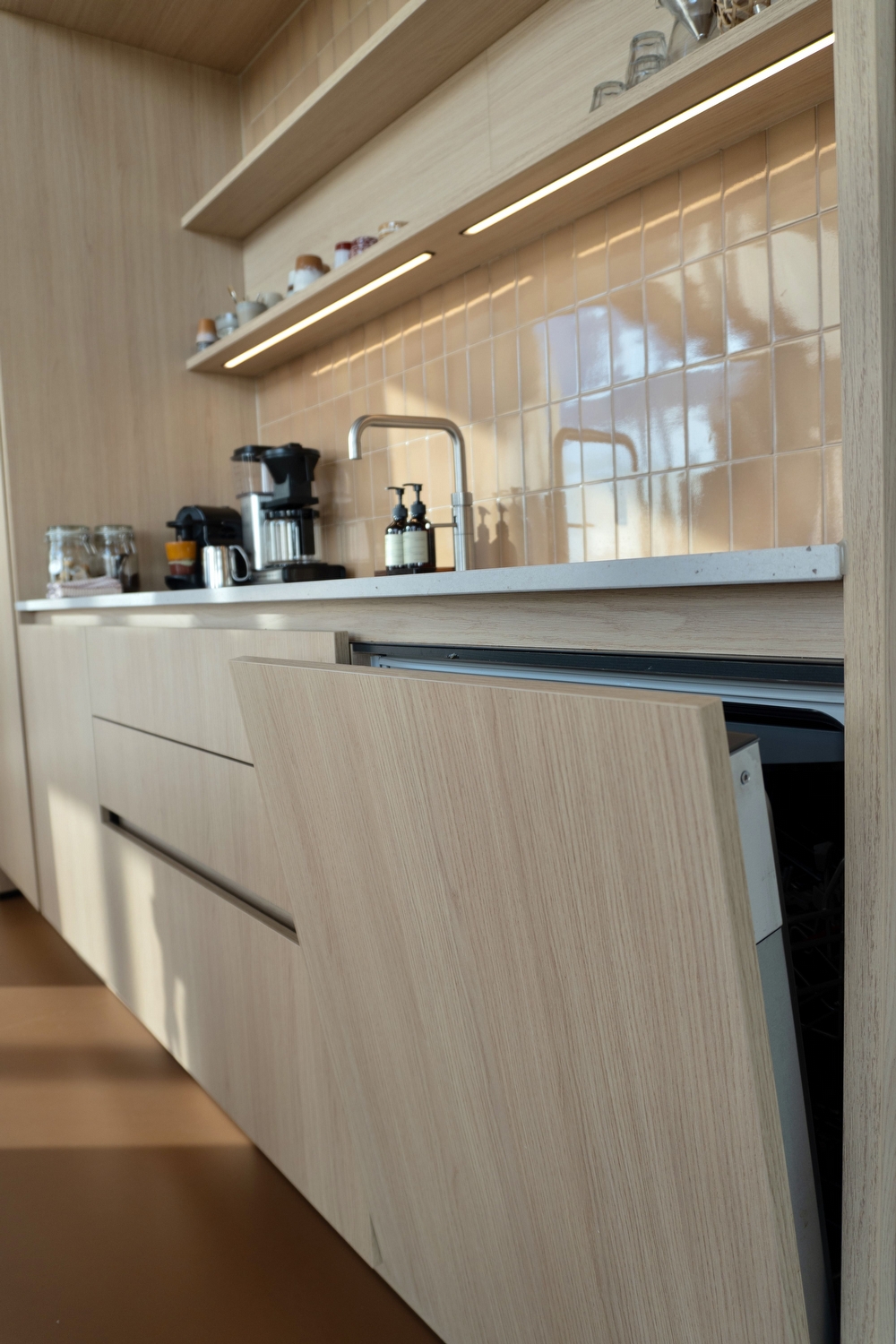 Naast de keuken realiseerden we ook een bijkeuken die perfect aansluit bij de rest van het ontwerp. Hier is ruimte voor een kleine spoelgelegenheid en staan de wasmachine en droger comfortabel op hoogte. Onder de machines zijn slimme lades geplaatst, zodat wasmiddelen en accessoires netjes opgeborgen kunnen worden.