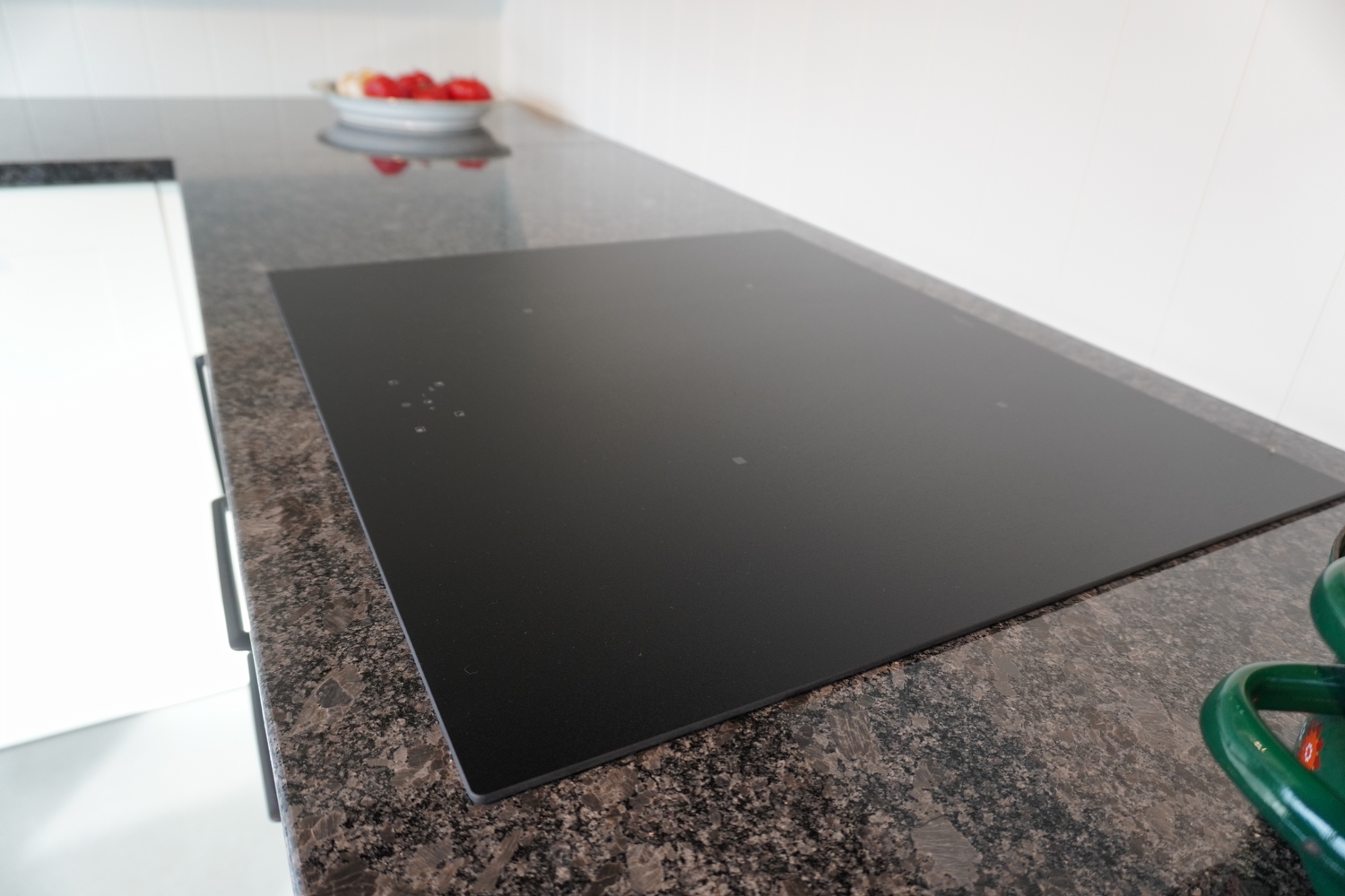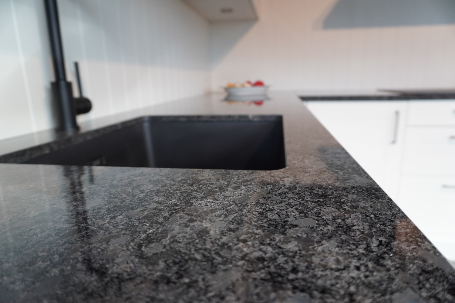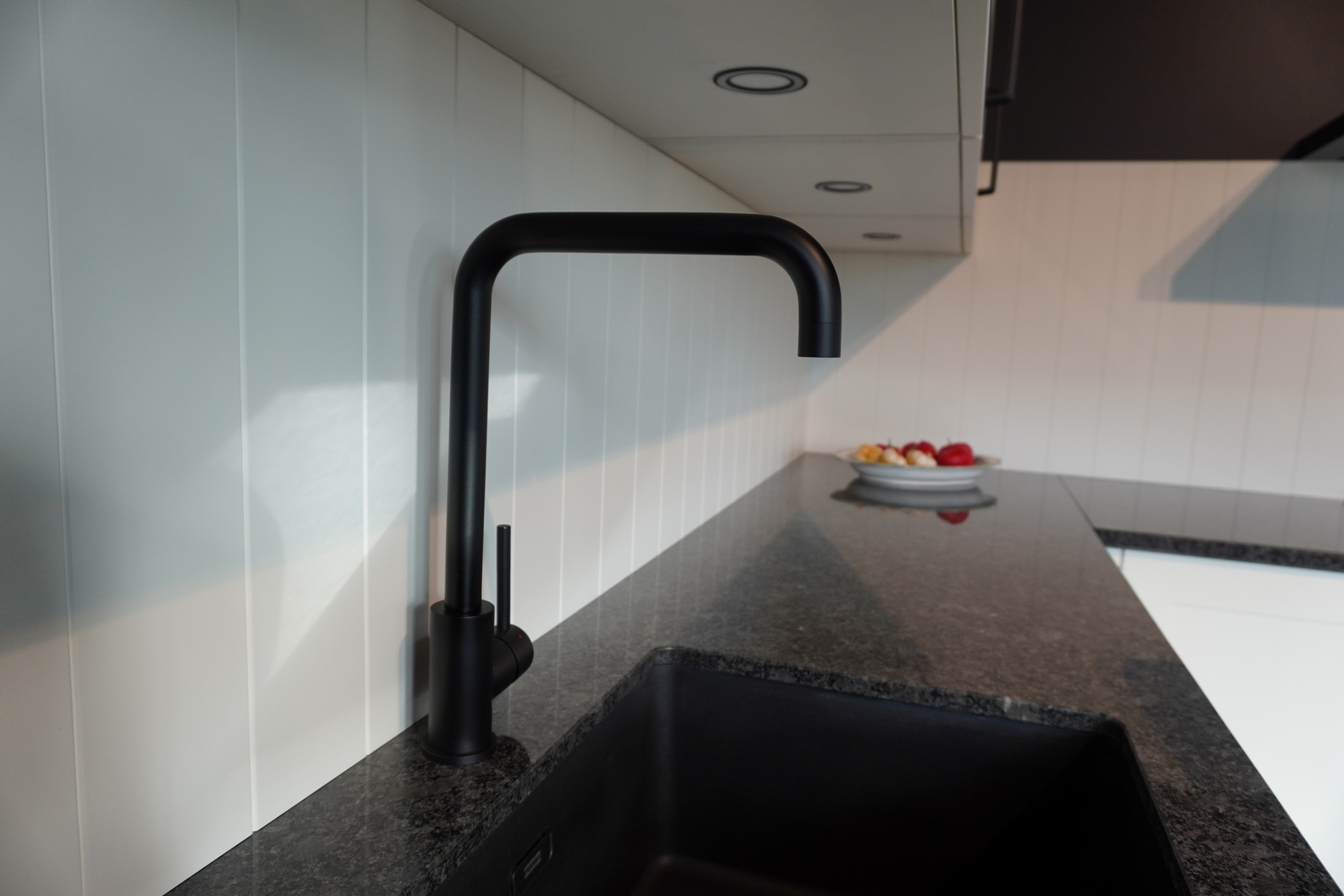 Het granieten werkblad in Steel Grey polished (20 mm) zorgt voor een luxe contrast met de witte fronten en geeft de keuken een robuuste, duurzame basis. De zwarte spoelbak van Franke vormt daarbij een stijlvol accent. De keuken is uitgerust met apparatuur van Pelgrim en een kraan van Caressi, waardoor functionaliteit en uitstraling mooi samenkomen.